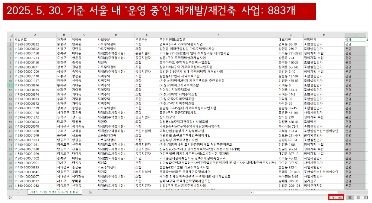 - 총 운영 중인 재개발/재건축 사업: 883건